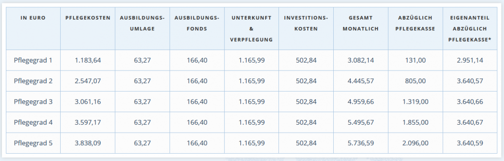 | In Euro | Pflegekosten | Ausbildungs- umlage | Ausbildungs- fonds | Unterkunft & Verpflegung | Investitions- kosten | Gesamt monatlich | abzüglich Pflegekasse | Eigenanteil abzüglich Pflegekasse* |